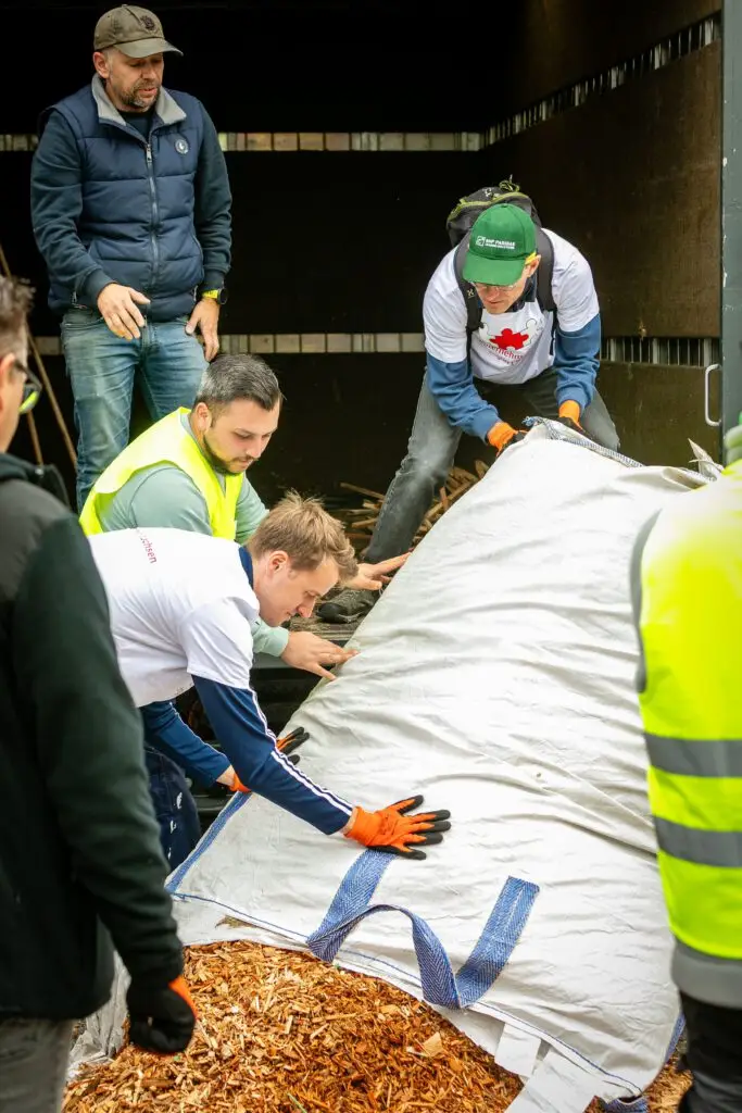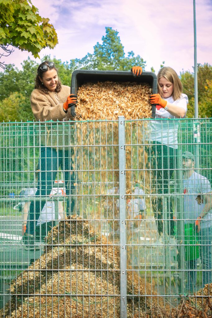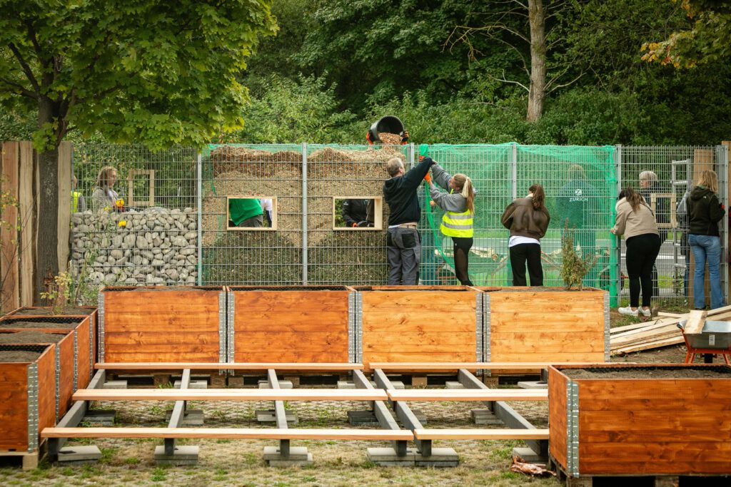 Bei bestem Herbstwetter wurde von vielen fleißigen Händen die Zaunanlage des Insektenhotels mit vielen Tonnen verschiedensten Naturmaterialien befüllt.