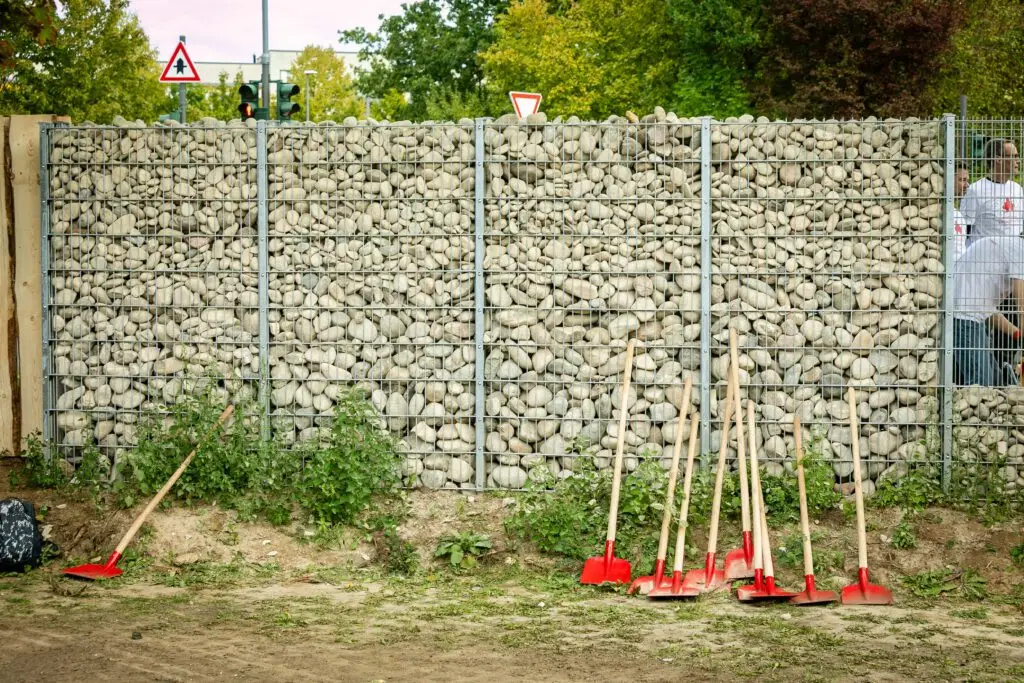 Der unschöne Stabmattenzaun war zuvor zu einer Gabionen Anlage umgebaut worden und ist dank der Befüllung mit Steinen, Holzscheiten und Holzschnitzeln jetzt ein Wohnparadies für viele Tierarten.